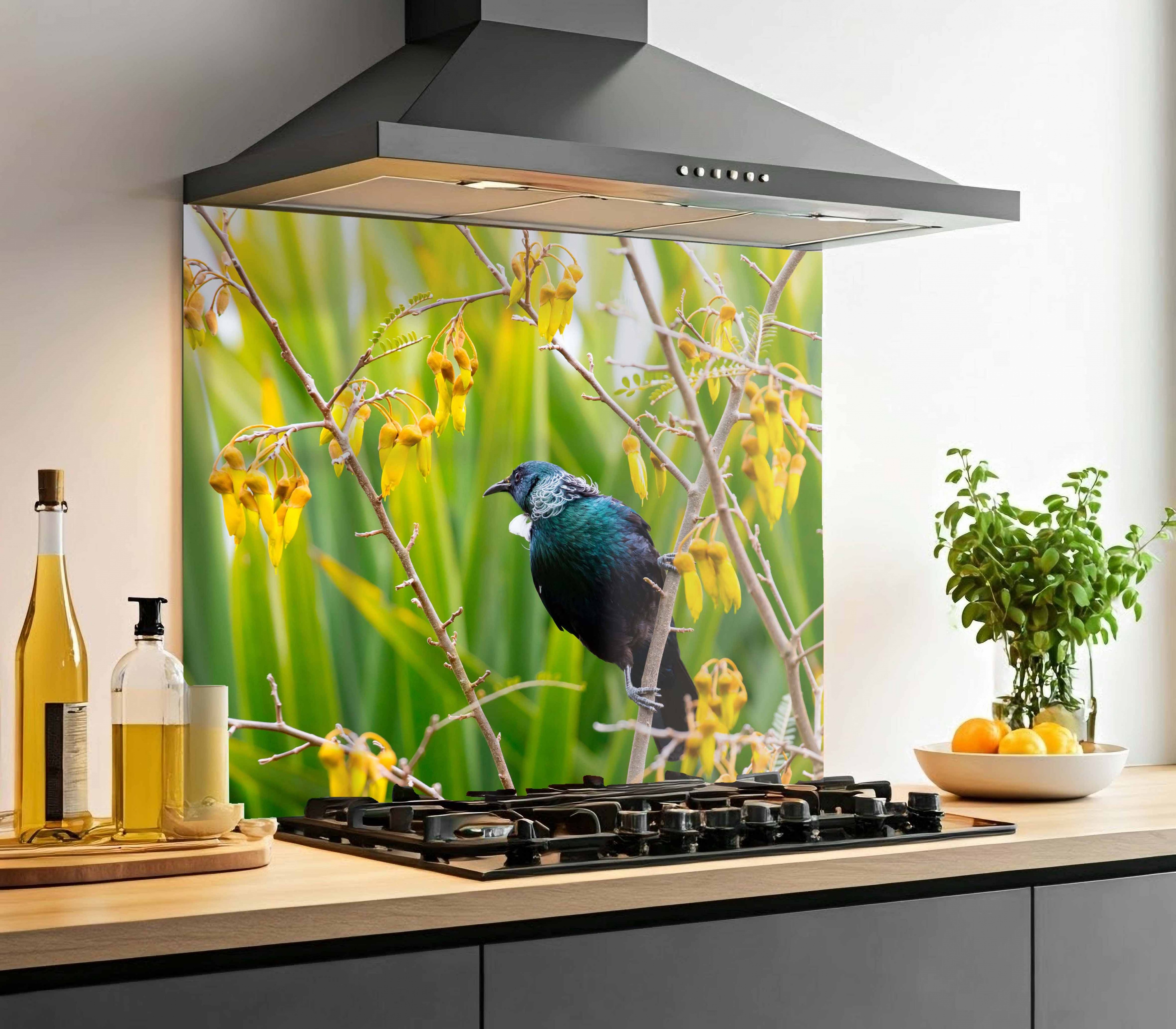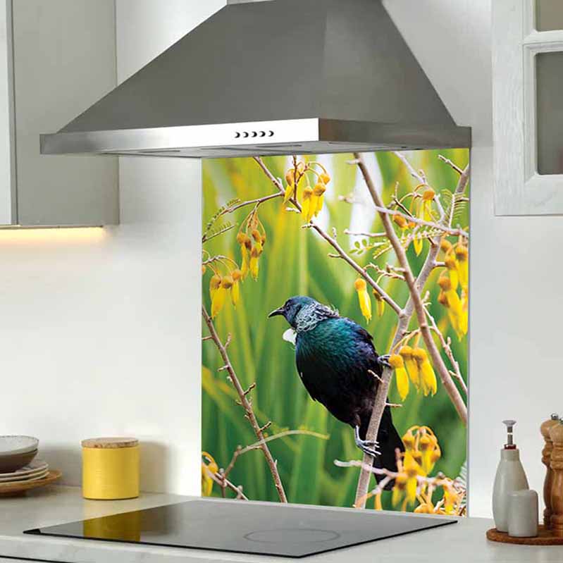 Featuring the DG1986 - Kowhai Tui design, this printed splashback adds a distinctive visual statement to your kitchen.